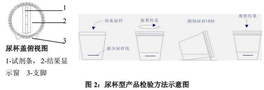 尿杯型:讓待測者直接收集尿液于檢測尿杯中,尿樣量須高于最低線。由專業(yè)人士負責收取盛有尿樣的尿杯,并蓋緊杯蓋。如杯蓋沒有正確的蓋緊,可能會造成 試劑盒中樣品的泄漏。使杯蓋兩支角支撐桌面,將檢測尿杯側倒 15 秒后,將檢測尿杯直立放置。